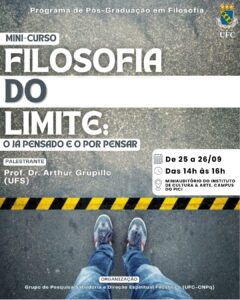 O curso de Pós-Graduação em Filosofia convida a comunidade acadêmica para participar do Minicurso: “FILOSOFIA DO LIMITE” que ocorrerá nos dias 25 e 26 de setembro no auditório do ICA – UFC. Com a participação do Prof. Dr. ARTHUR GRUPILLO (Universidade Federal de Sergipe – UFS)