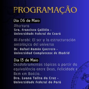 Data da publicação: 19 de abril de 2024 Categoria: NotíciasO Seminário Internacional de Ontologia Medieval é um evento promovido pelo Programa de Pós-Graduação em Filosofia da Universidade Federal do Ceará – UFC juntamente com Grupo de Estudos em Filosofia Medieval (GEFIM – UFC/CNPq).